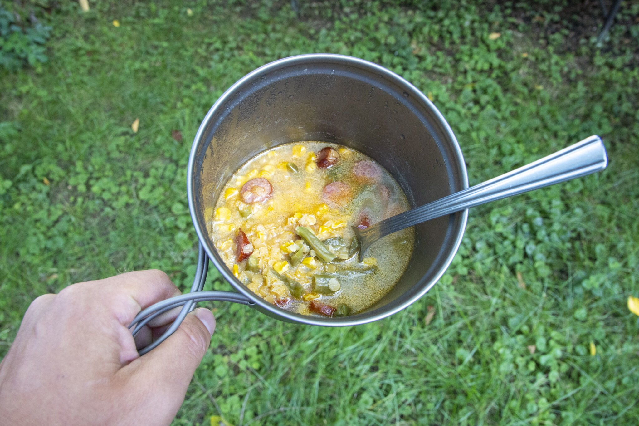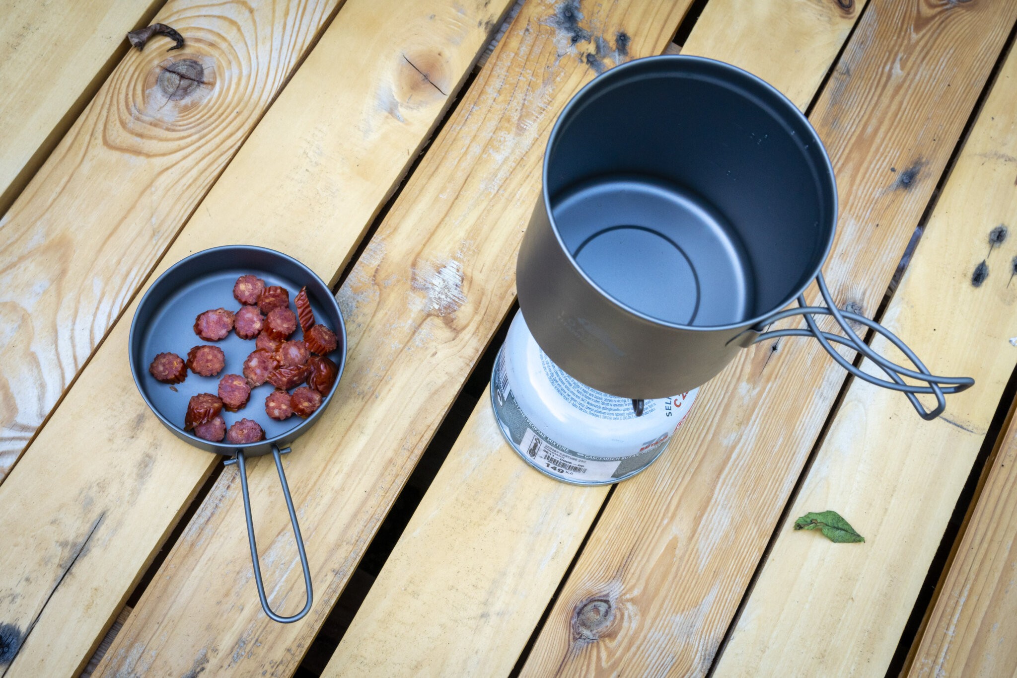 Fyzika předurčuje titanové nádobí spíše k vaření vody než hustých omáček, které by se mohly připéct. Což mi nevadí, protože stejně většinu věcí na treku vařím ála polévka, kterou později zahustím kuskusem, brkaší atp. Ranní kaše, vločky nebo krupice v něm s určitou opatrností půjdou připravit také. Jen to chce hodně míchat a počítat s rizikem připálení. Červenou čočku s opečenou klobáskou jsem si uvařil naprosto bez problému, takže vyčtená rizika beru s nadhledem.